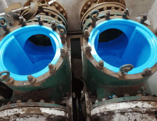 In this case we are rebuilding and coating a seawater strainer filter that was heavily corroded.